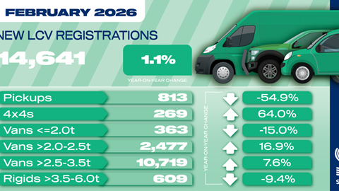 UK new light commercial vehicle (LCV) registrations rose by a modest 1.1% in February, with 14,641 vans, pickups and 4x4s joining the road, according to the latest figures published by the Society of Motor Manufacturers and Traders (SMMT).